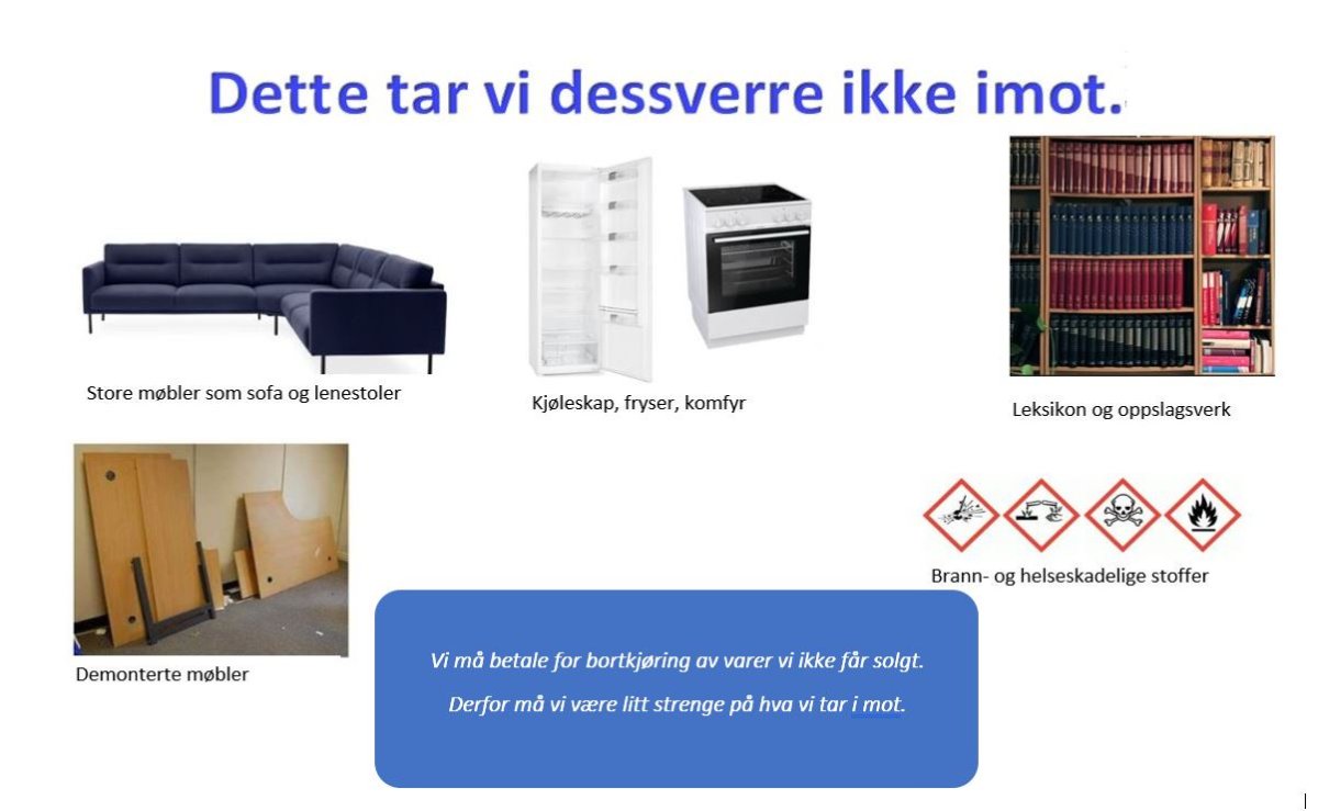 Basert på erfaring tar vi ikke imot følgende fordi det ikke selges eller fordi det er for mye jobb eller vi har for mye av det: